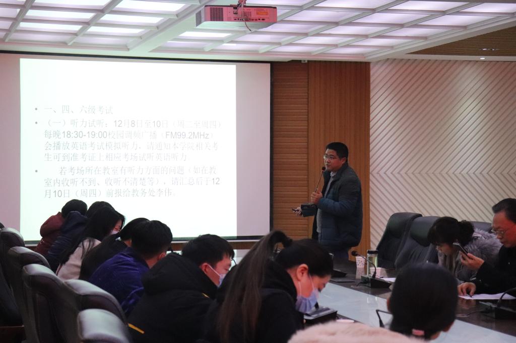教学秘书陈浩对英语四、六级考试及期末考试做出具体工作安排。行政秘书陈俊对太阳成tyc9728集团普通本、专科学生违纪处分的相关文件进行宣读。学工秘书徐远东对学风建设相关工作予以安排,他对太阳集团网tyc9728荣获全校学风建设先进单位的成就表示肯定,并对于申请单位评选和先进班级集体评选的硬性标准进行阐释。