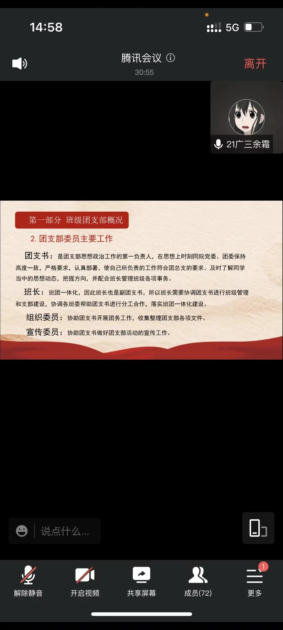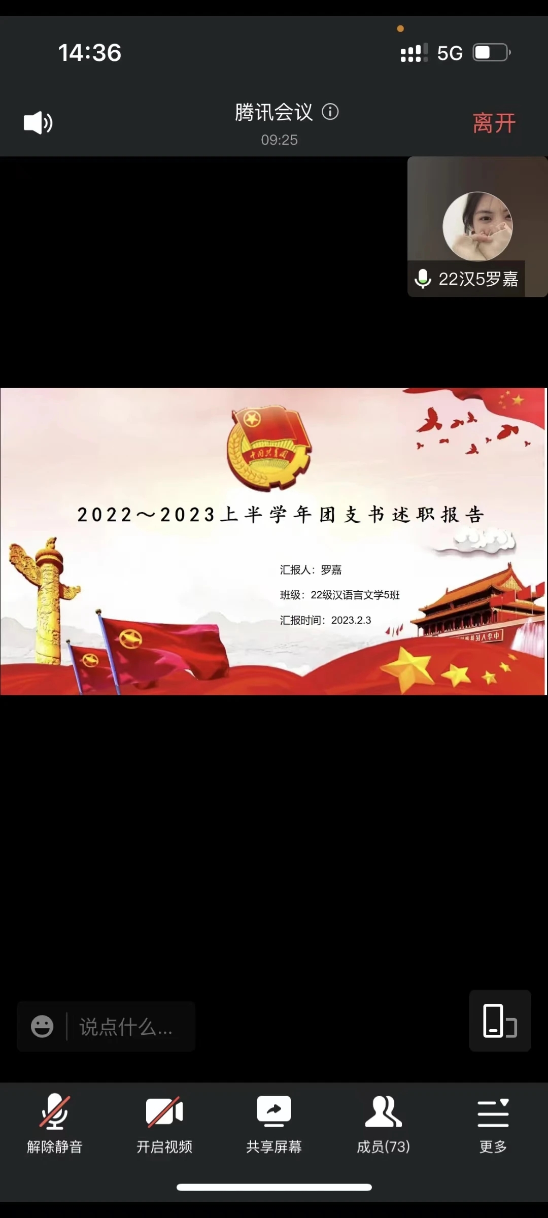为全面贯彻落实团中央相关精神和全面从严治团的各项要求,激发基层团组织活力,提高工作部署落实成效,太阳集团网tyc9728于2023年2月3日召开线上基层团组织书记述职评议会议。太阳集团网tyc9728党总支书记李赟、学工秘书徐远东、团总支书记何军华及各班团支部书记参加了此次会议。本次会议由团总支书记何军华主持。