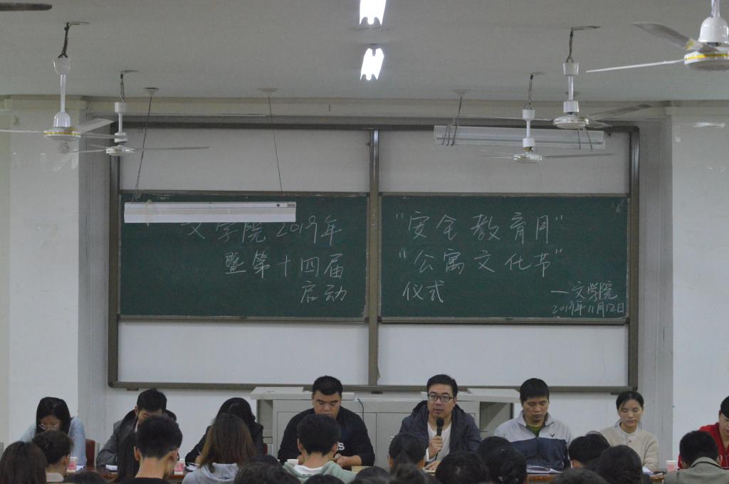 会议第一项,由辅导员张细柳宣读“安全教育月”“公寓文化节”活动的通知,并对主要工作进行安排:第一阶段,宣传动员阶段;制定活动方案,进行宣传活动,组织学生积极参与。第二阶段,具体实施阶段;每个班级召开“安全教育”为主题的班会,并组织2019级新生进行校规校纪考试。第三阶段,主题宣传阶段;普及宣传活动,各学院集中在田径场主干道两侧,摆放普及展板,并在院系网站主页及微信公众号平台宣传安全知识,以及举办“防范信息诈骗,远离校园贷款”主题报告会。