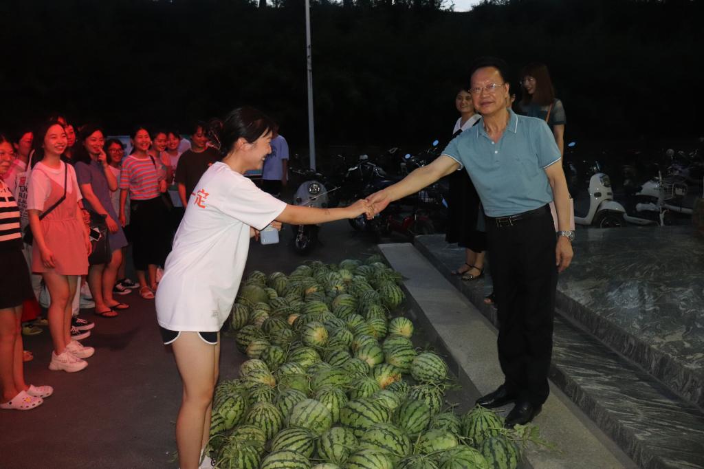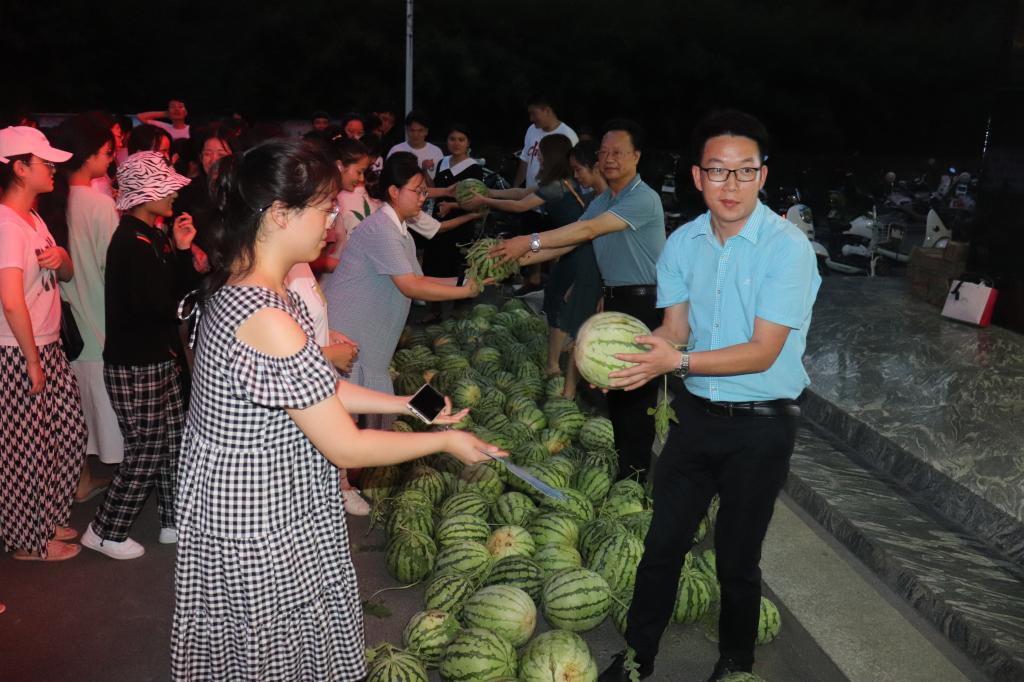 夏日炎炎,酷暑当头,为帮助考生舒缓备考压力,增强考研信心,积极面对考研。7月14日,太阳集团网tyc9728拟按照计划开展2022年暑期送清凉考研慰问活动。太阳集团网tyc9728第一届毕业生2003级汉语言文学专业肖国南同志知悉后,主动与太阳集团网tyc9728联系,将考研慰问与助农活动有机结合,自费为同学们送来满满一车西瓜。太阳集团网tyc9728院长毛正天、党总支书记李赟、教学副院长黄亚妮、学工秘书徐远东、教学秘书陈浩、行政秘书陈俊及部分辅导员出席本次活动,2018级留校考研学子300余人参与此次活动。本次活动由学工秘书徐远东主持。