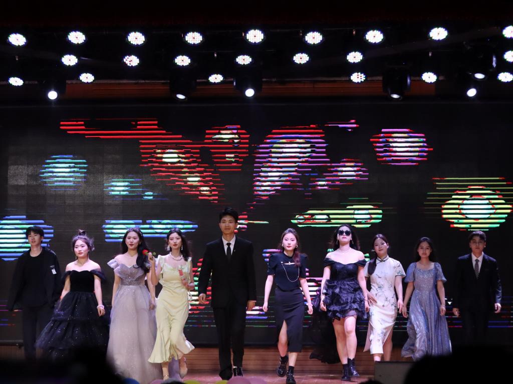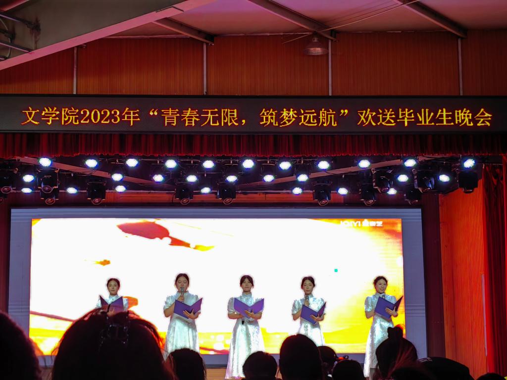 在开场之初,主持人对在场领导和老师表示热烈欢迎,在欢声笑语中,此次毕业生晚会拉开序幕。开场舞《poppy》以欢快而又活泼的节奏,展现了青春的自由与热烈;诗歌朗诵《写给未来的你》、《起航》生动展示了青年无限的可能及敢闯敢做的勇气;古典舞《飞天彩虹》通过舞者优美的舞姿和高难度的动作,再现了中国古典文化的魅力;《歌曲串烧》以不同风格的切换,让我们感受到了青春的多姿多彩;话剧表演《虎父无犬子》通过生动的表演体现了家庭教育对孩子的影响,在幽默风趣的话语中传达正确的教育理念;伴着古风的音乐,汉风国韵社的成员们带来的《汉风国韵汉服走秀》,一场美妙的视觉盛宴,诠释了中国文化和中国元素的魅力;小品《时间都去哪了》聚焦当下虚度时间的现象,普及抖音、微博等各类APP背后的算法推荐系统以及技术,呼吁提高抵抗力和自制力;《T台走秀》通过精彩的展示展现了青春的美好与激情;合唱《凤凰花开的路口》和《仰望星空》流露出分别时的不舍和留恋,表达对未来的美好希冀。在声声的团歌中,此次晚会完美落下帷幕。