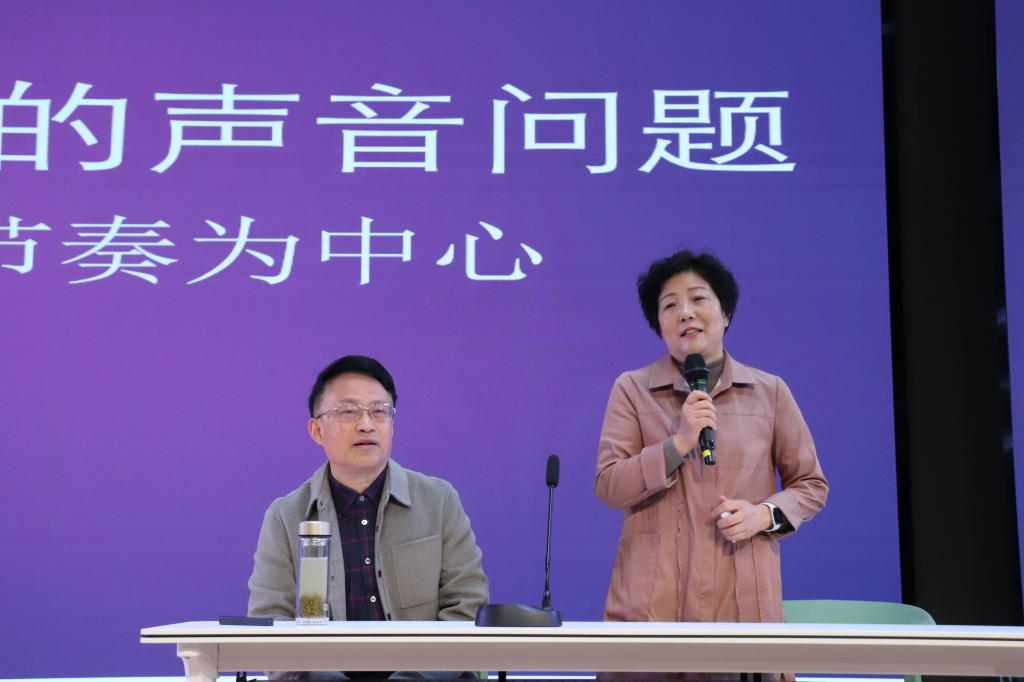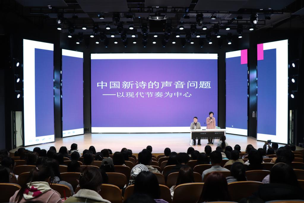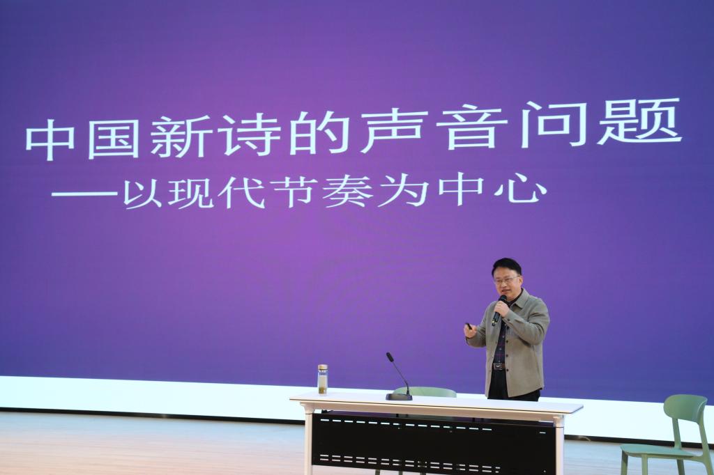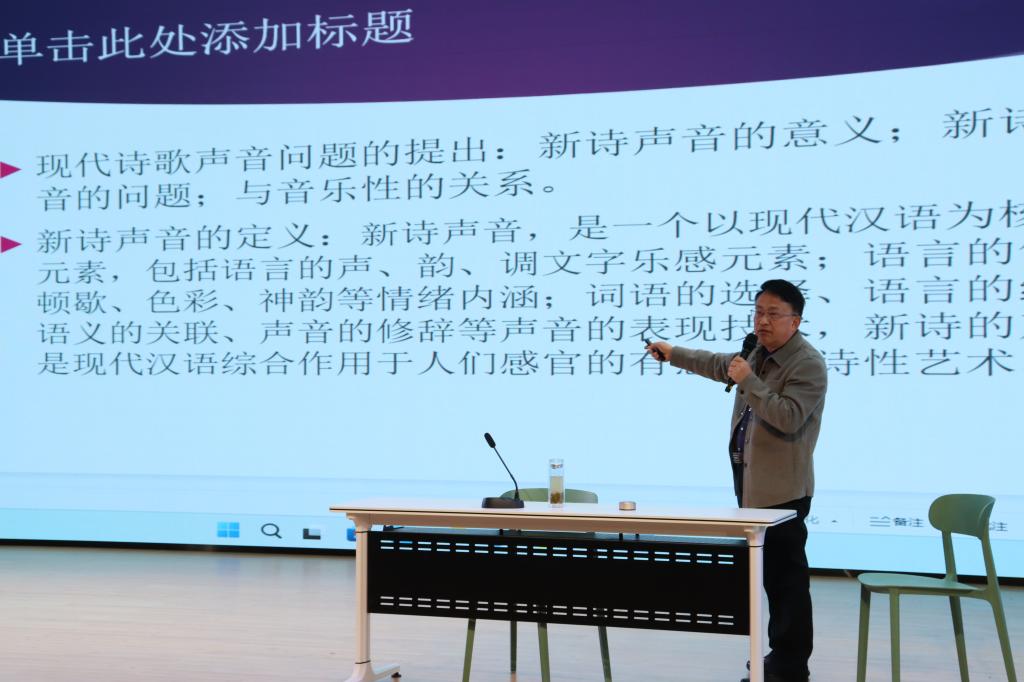 王教授认为诗歌作为一种教育方式不仅仅是一种文化教育,更是一种人格教育,也是一种成长教育,是古时读书人的基本功,其远远超出了文学教育的范畴。王教授为在座师生详细介绍了诗歌的由来演变,古代诗歌教育因受传播方式所限比较依赖言传身教的方式传播,这就造成诗歌尤其讲究声音的特点,而最早在文学艺术启蒙的时候,诗歌是辅助唱歌的副产品,发展到后来,诗歌脱离音乐自成一派,因此诗歌身上具有音乐的痕迹。然而由于古代诗歌深受格律所限,诗人不能充分的表情达意,所以现当代诗人不断寻求诗歌体裁的突破。王教授由此提出了“我们新诗的声音究竟发生了些现代型转变”“新诗声音的理论思考与实践出现了什么样的问题”“如何重建新诗的声音理论与实践路径”等一系列问题,表示新诗急需破格与突破,急需寻找新的声音。