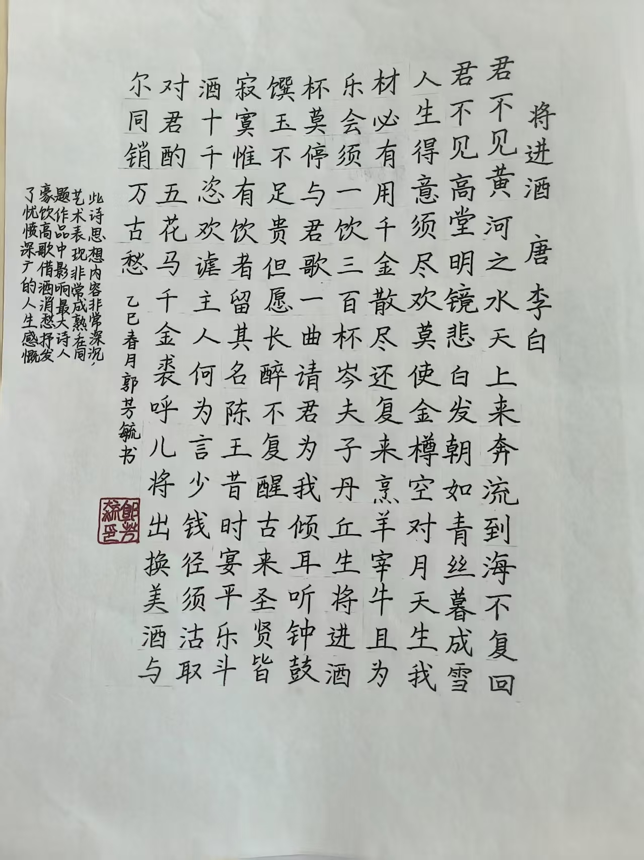 本次书法创作活动特设毛笔与硬笔双赛道,参与者可根据自身专长选择任意赛道提交作品。在创作要求上,硬笔书法需遵循横竖成行、结构工整的规范,毛笔作品则强调笔法力度与章法布局,灵活运用楷书、行楷、行书其中一种字体。最终将根据字体规范性、艺术表现力和创作完成度三个方面进行综合评选。