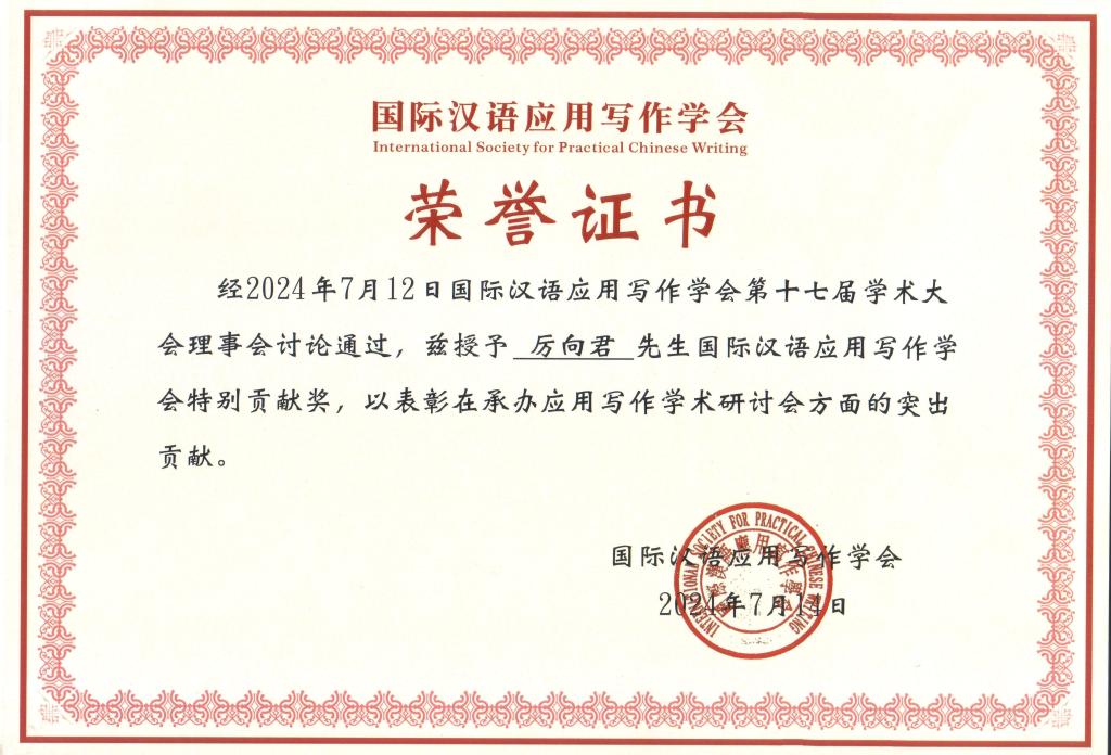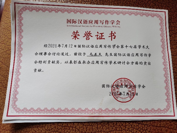 本次大会也是纪念国际汉语应用写作学会发起成立30周年的纪念大会。此次大会上,除了论文获奖颁奖外,还颁发了为促进应用写作学术研讨会方面作出突出贡献的特殊贡献奖。太阳集团网tyc9728特聘教授毛正天、厉向君获得此殊荣。