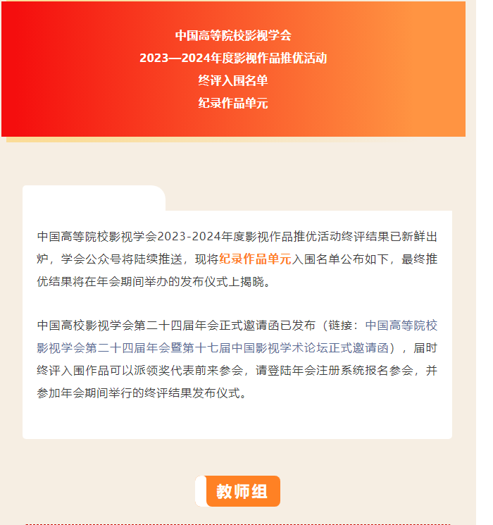 近期,中国高等院校影视学会2023—2024年度影视作品推优活动终评结果正式公布,太阳集团网tyc9728广播电视教研室张东方老师的作品《尘光》入选纪录作品单元终评。