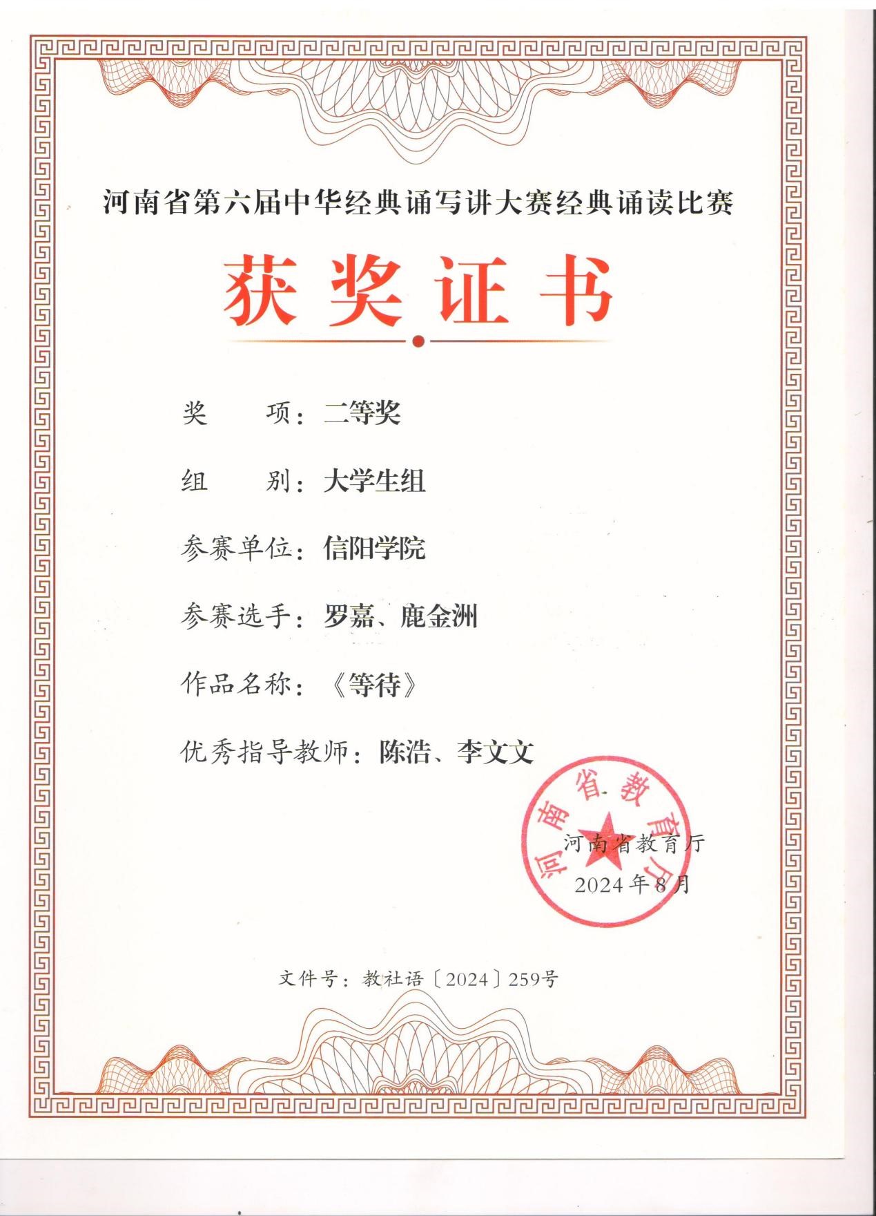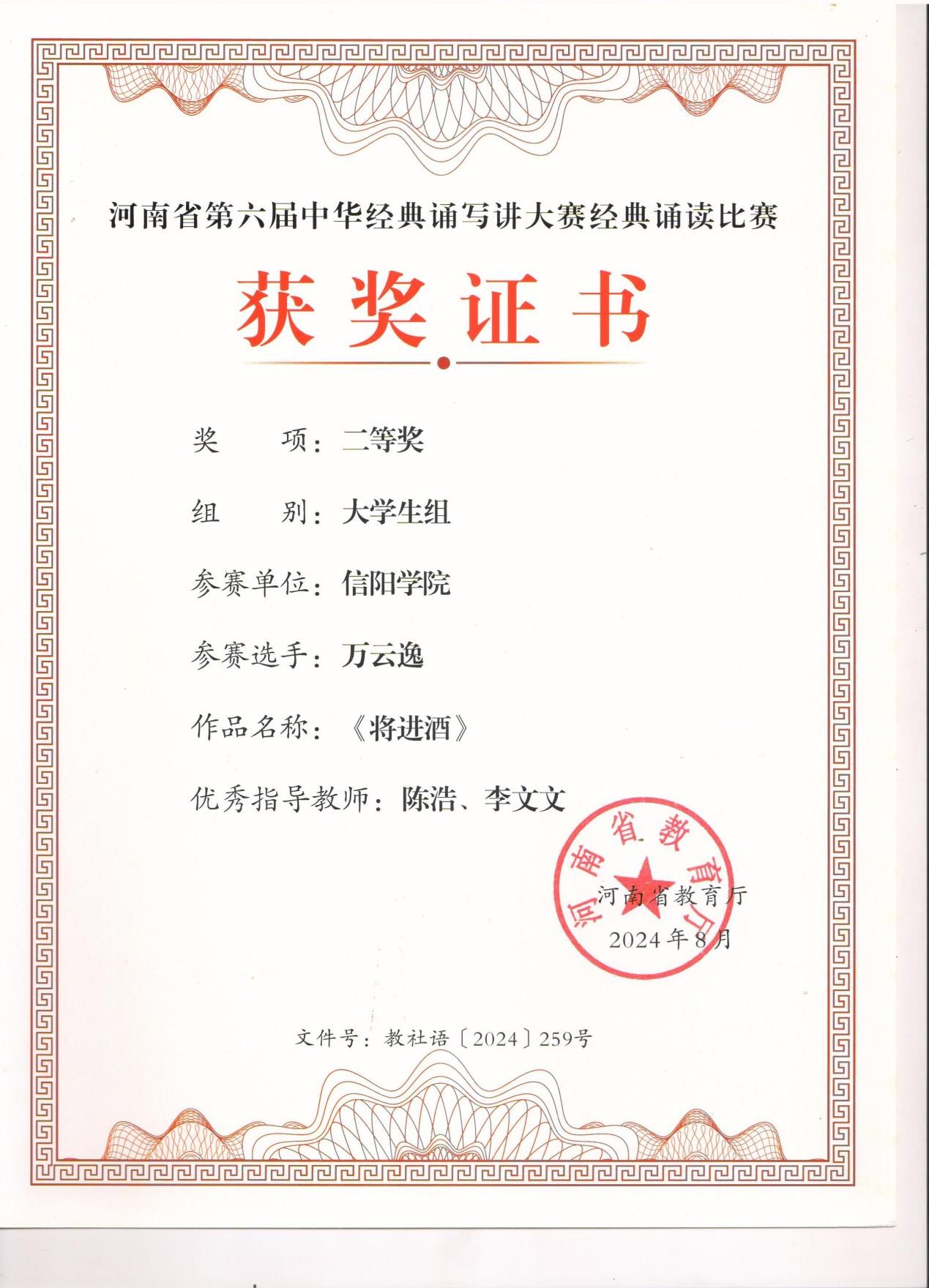 同时,在学生组比赛中,太阳集团网tyc9728的学子们也不负众望,罗嘉、鹿金洲朗诵作品《等待》,万云逸朗诵作品《将进酒》荣获大学生组二等奖,充分展现了太阳集团网tyc9728学生在中华经典文化传承方面的热情和才华。这些成绩的取得,离不开师生们的辛勤付出和刻苦训练,也离不开学院对中华优秀语言文化传承与发扬工作的高度重视和大力支持。