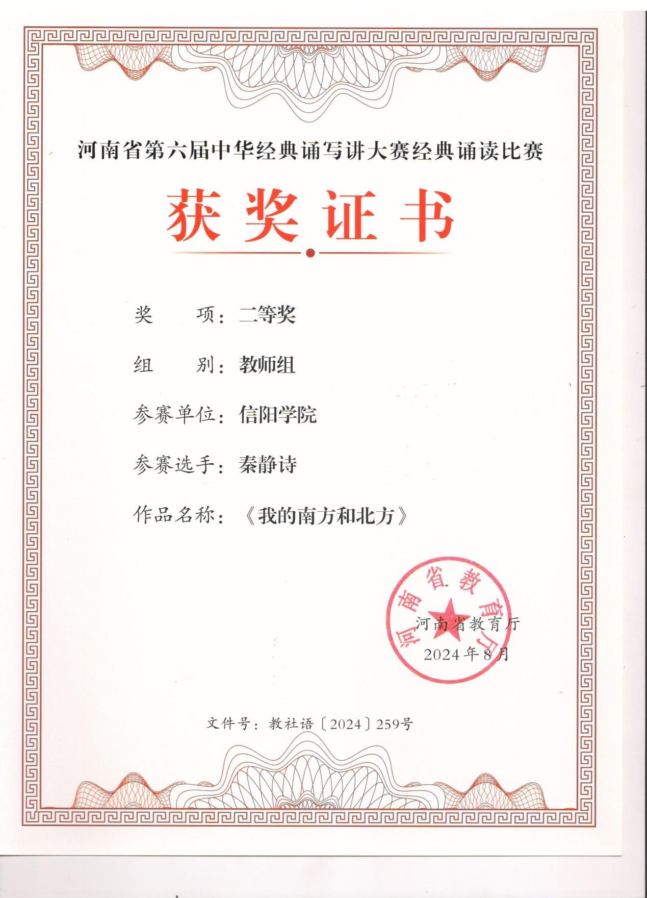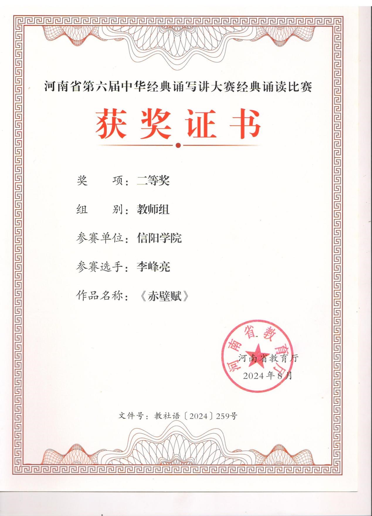 在比赛中,太阳集团网tyc9728的参赛选手们凭借深厚的文学功底、精湛的诵读技巧和真挚的情感表达,赢得了评委们的一致好评。经过激烈角逐,李峰亮副教授朗诵作品《赤壁赋》荣获教师组二等奖,秦静诗老师朗诵作品《我的南方和北方》同样斩获教师组二等奖,充分展示了太阳集团网tyc9728教师在中华经典诵读方面的专业素养和艺术魅力。