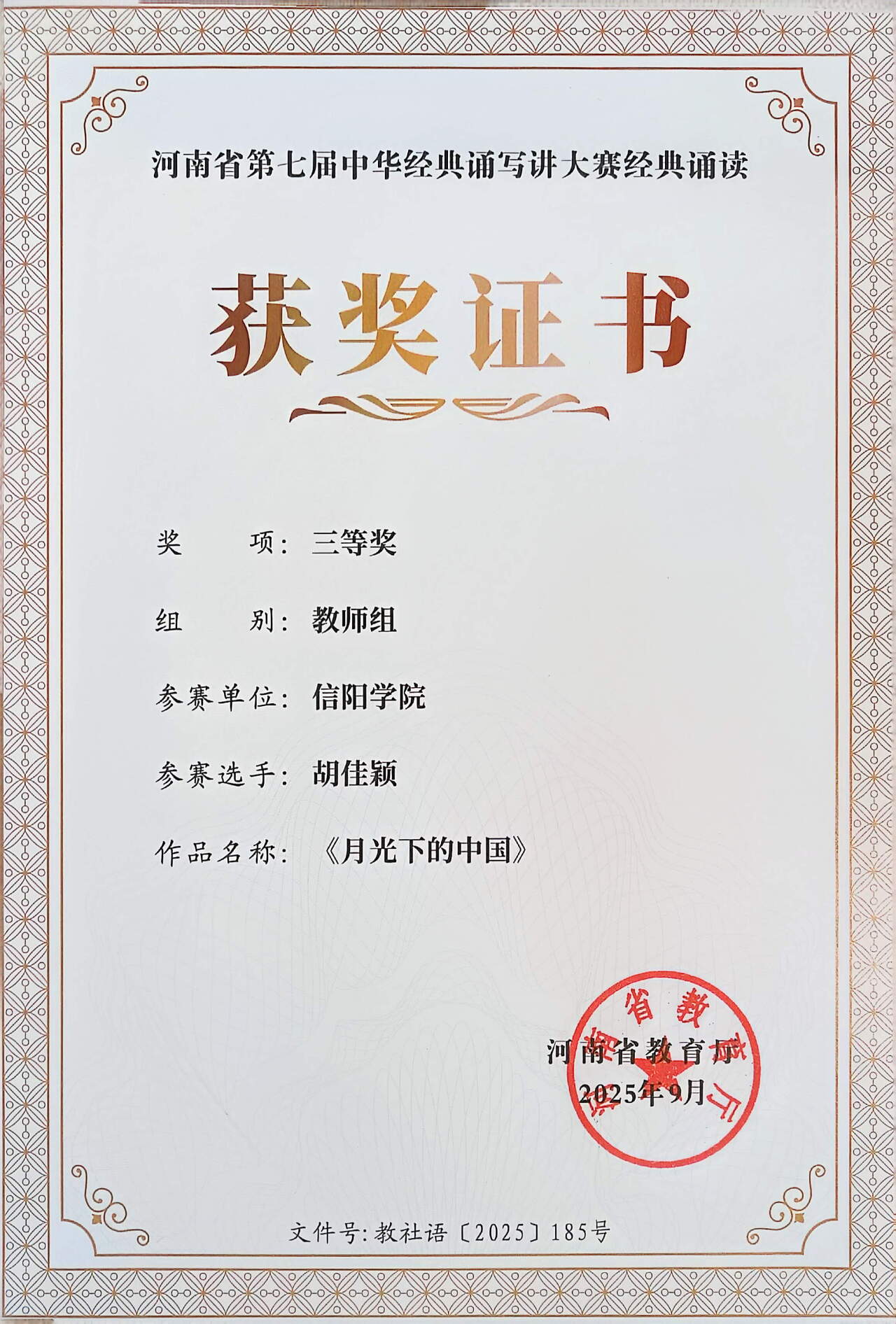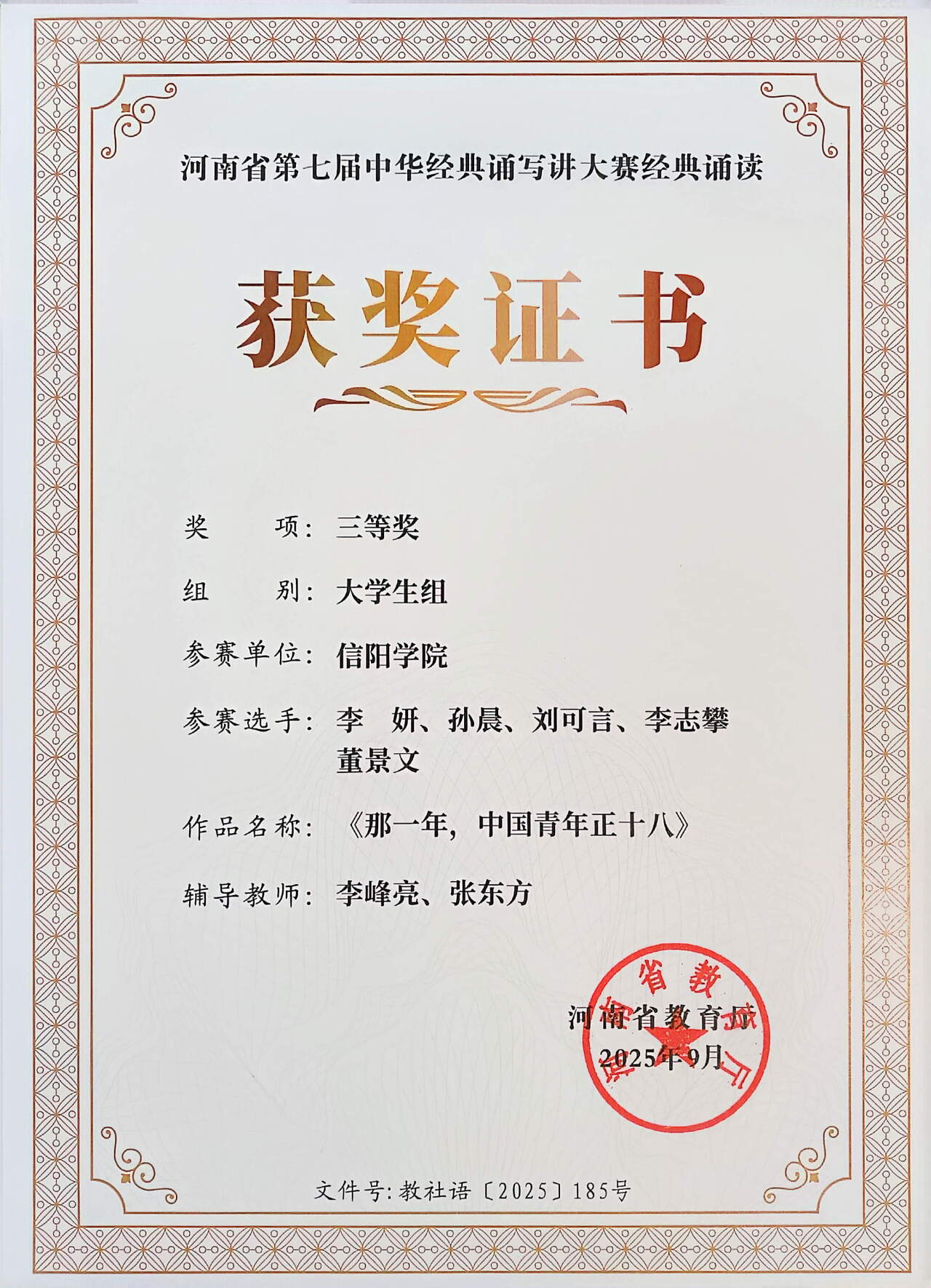 近日,河南省教育厅官网正式公布第七届中华经典诵写讲大赛(河南赛区)“诵读中国” 经典诵读大赛评选结果。太阳集团网tyc9728师生凭借深厚的文化底蕴与精湛的诵读技艺脱颖而出,斩获3 项省级三等奖,再续赛事佳绩。