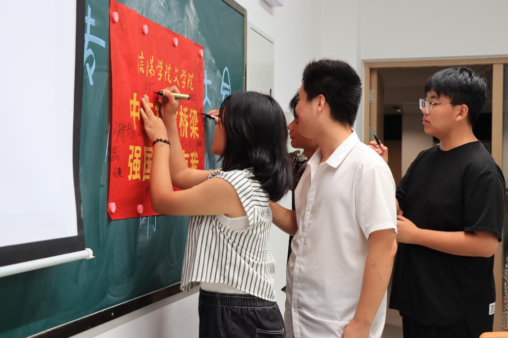最后,在老师的号召下,所有同学一同在“中文搭建桥梁 强国建设有我”的宣传条幅上签下了自己的名字,大家对于未来四年的大学生活充满了信心和期待。