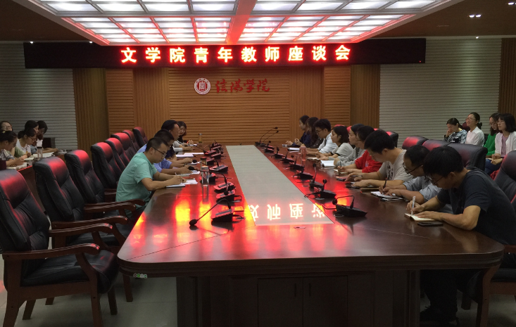 9月18日下午,太阳集团网tyc9728在人文楼208会议室招开青年教师座谈会,参加会议的有院长毛正天,教学秘书陈浩、行政秘书陈俊、教学干事王松以及全体青年教师。