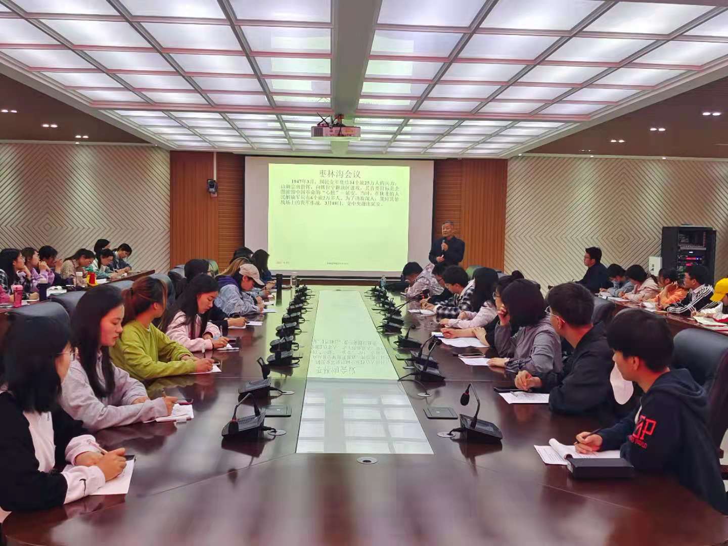 王强副校长结合视频、图片及自身经历,以生动形象的语言分别从四个部分为我们阐述了“西柏坡与新中国”。第一部分以历史选择了西柏坡为主题,主要讲述刘少奇、朱德等人组成中央工作委员会,前往华北进行中央委托工作,阐释了以华北作为根据地的优势。第二部分以谋划建国大业为主题,解析了在人民代表大会中毛泽东发表的重要讲话,石家庄的解放为中共中央移往西柏坡指挥三大战役奠定了基础,为筹建新中国创造了条件。第三部分以华北人民政府——中央人民政府的雏形为主题,详细讲解了华北人民政府的建立和河北人民政府的成立。第四部分则以进京赶考为主题,指出新中国从西柏坡走来,西柏坡精神是立邦安国的宝贵精神财富,我们要发扬优良传统,争取更大的建设成就。