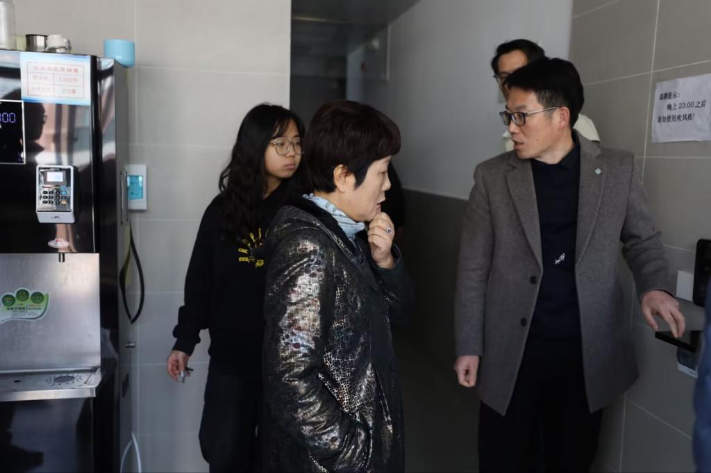 张凌江院长在党员宿舍走访过程中与学生亲切交谈,了解学生近期的学习、生活情况,并详细地询问了同学们对于教学以及校园工作的一些建议,她希望同学们能够认真对待下一阶段的学习和生活。同时,张院长也强调了宿舍卫生及用电安全等情况,确保学期期末各项工作平稳、有序地落实。