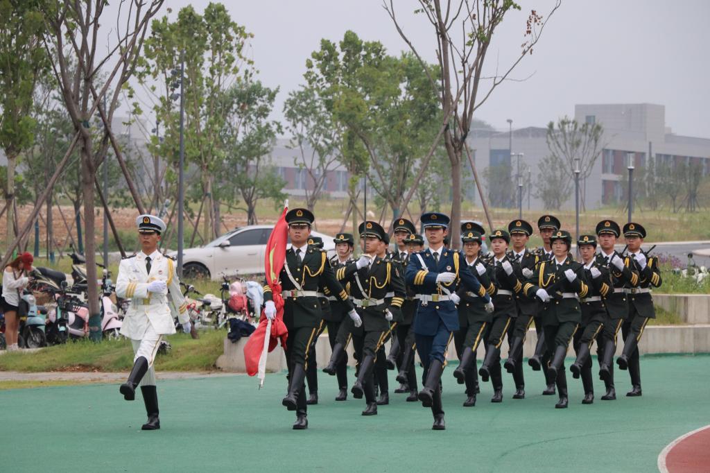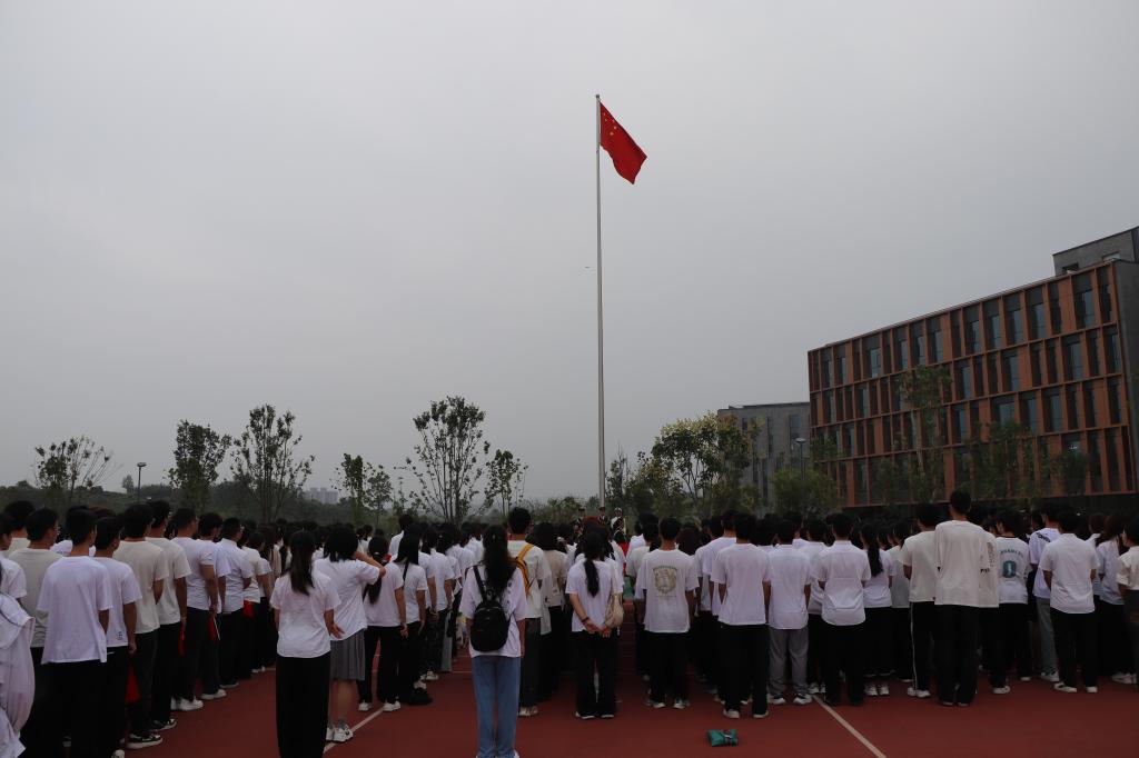 英姿飒爽的国旗护卫队迈着铿锵有力的步伐护卫五星红旗入场,他们的身影在灰白天空的映衬下显得格外挺拔。“向国旗——敬礼!”的口令响起,鲜艳的五星红旗在《义勇军进行曲》中徐徐上升。全体师生面向国旗行注目礼,高昂的国歌声在开阔的广场上回荡。