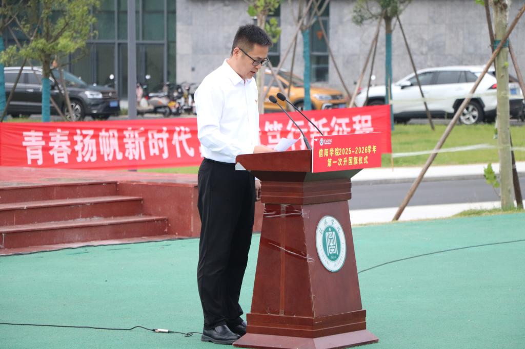 为进一步加强爱国主义教育,增强师生集体荣誉感和民族责任感。9月8日上午,我院于南湖校区田径场升旗台开展以“山河不忘英雄志,青春信院续华章”为主题的升国旗仪式。太阳成tyc9728集团副校长王志华、纪委书记杨高伟、学生处、南湖校区各学院书记、学工负责人、辅导员以及学生代表参加此次升国旗仪式。升国旗仪式由纪委书记杨高伟主持。