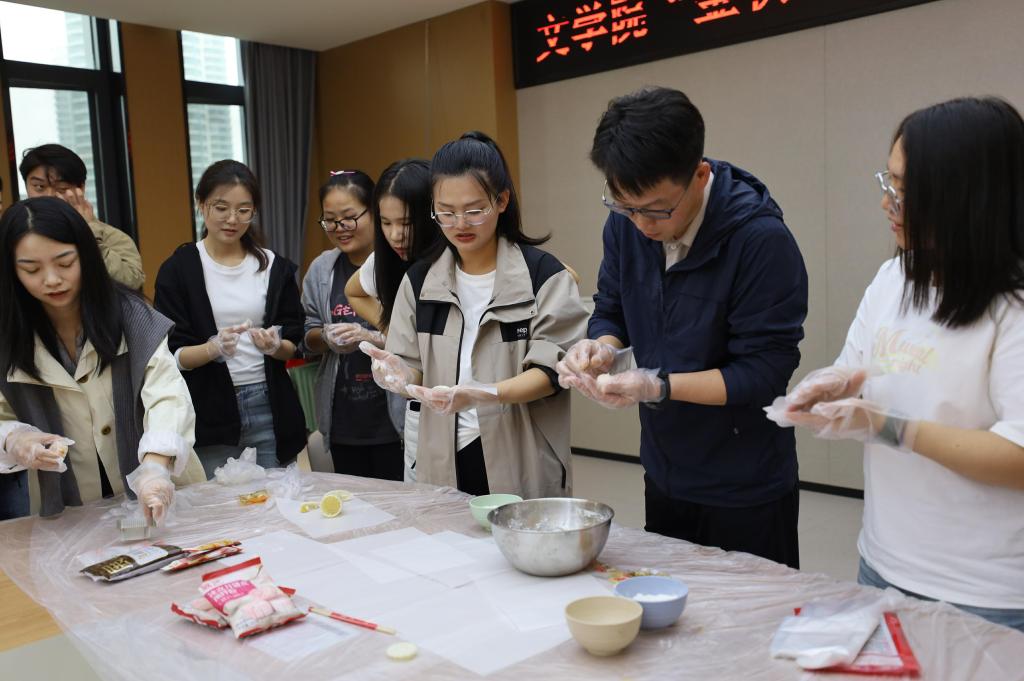 活动伊始,“冰皮月饼手作”环节便迅速拉近了师生距离。在段艳婷老师的演示下,大家围坐一堂,揉皮、包馅、压模,协作默契。印有国旗和月亮图案的模具制作出的不仅是香甜的月饼,更是师生间携手合作的温情与对家国团圆的美好祝愿。现场气氛温馨,其乐融融。
