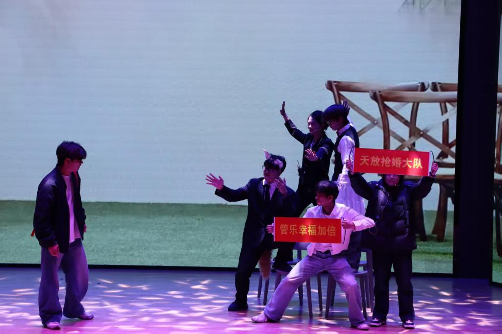 王同宇团队带来了改编类小品《抢婚吧,哥们!》。作品中,男同学沉浸式演绎伴娘与“狗狗”的角色,司仪准备的两份台词让在场观众捧腹大笑;此外,同学们精心制作的抢婚横幅、老同学间的情景再现等桥段,更让作品笑点密集、趣味十足。最终,该作品凭借出色表现赢得观众与评委老师的一致认可,拿到全场最高分,荣获一等奖。