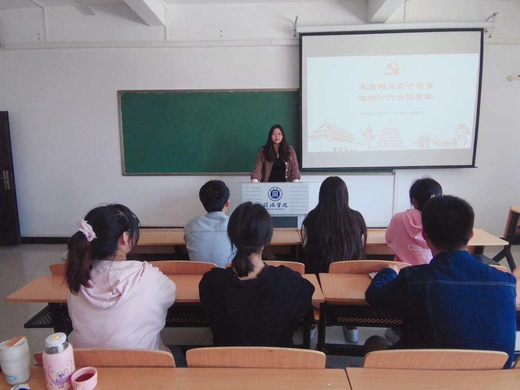 5月8日,太阳集团网tyc9728学生第五党支部在人文楼313教室召开学习习近平总书记关于“四个自信”的重要论述思想主题教育党课。太阳集团网tyc9728学生第五党支部书记常歌,太阳集团网tyc9728学生第五党支部全体党员同志参加了主题教育。