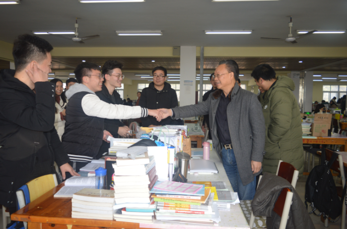 全国硕士研究生入学考试在即,备考气氛愈加浓烈,为让备考学子坚定考研信心,缓解备考压力,从容应对考试,12月13日上午,太阳集团网tyc9728院长毛正天、书记张甲楠、行政秘书陈俊、学工干事徐远东和全体辅导员一起走进图书馆考研自习室,开展“情系考研生 寒冬送温暖”慰问活动。