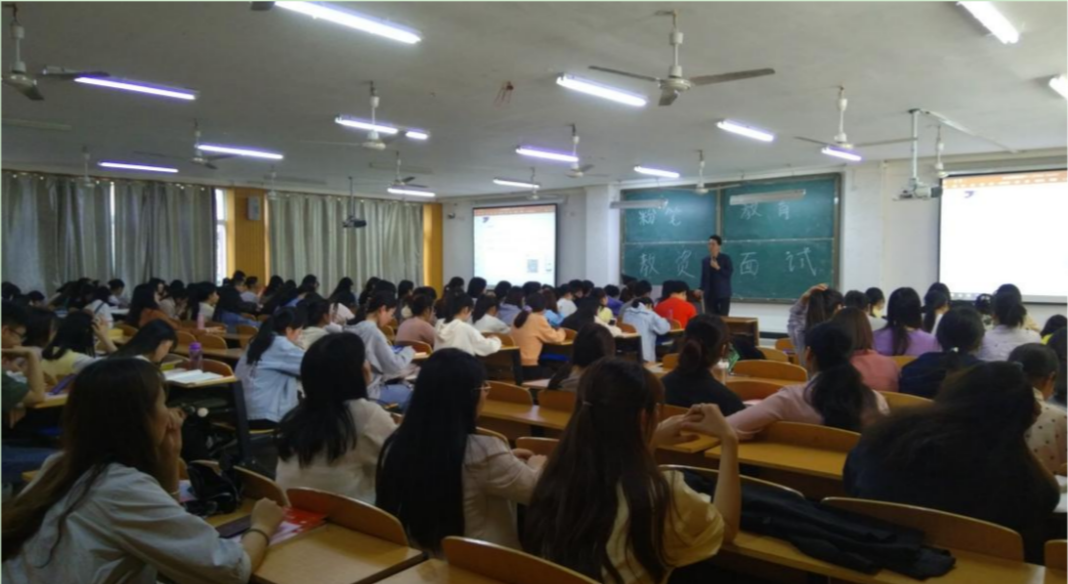 本次讲座的主题是关于教师资格证面试指导,培训讲师从面试流程、案例剖析以及注意事项三方面与同学们进行分享交流。讲师们从教资面试的整个流程,并举出几个典型案例带领同学们模拟考场环境,分析教学思路,找准教学重难点。同时讲师还结合自身经历,强调了面试过程的注意事项,“着装得体,落落大方”,鼓励同学们站上讲台一定要自信,不必过分紧张。讲师们指出在讲课中合理设计互动与板书,试讲时不要拖堂。最后,他们对于同学们提出的问题,耐心地进行了解答,并预祝同学们取得好成绩。