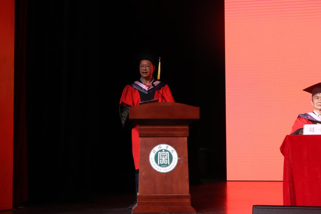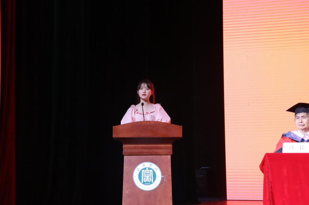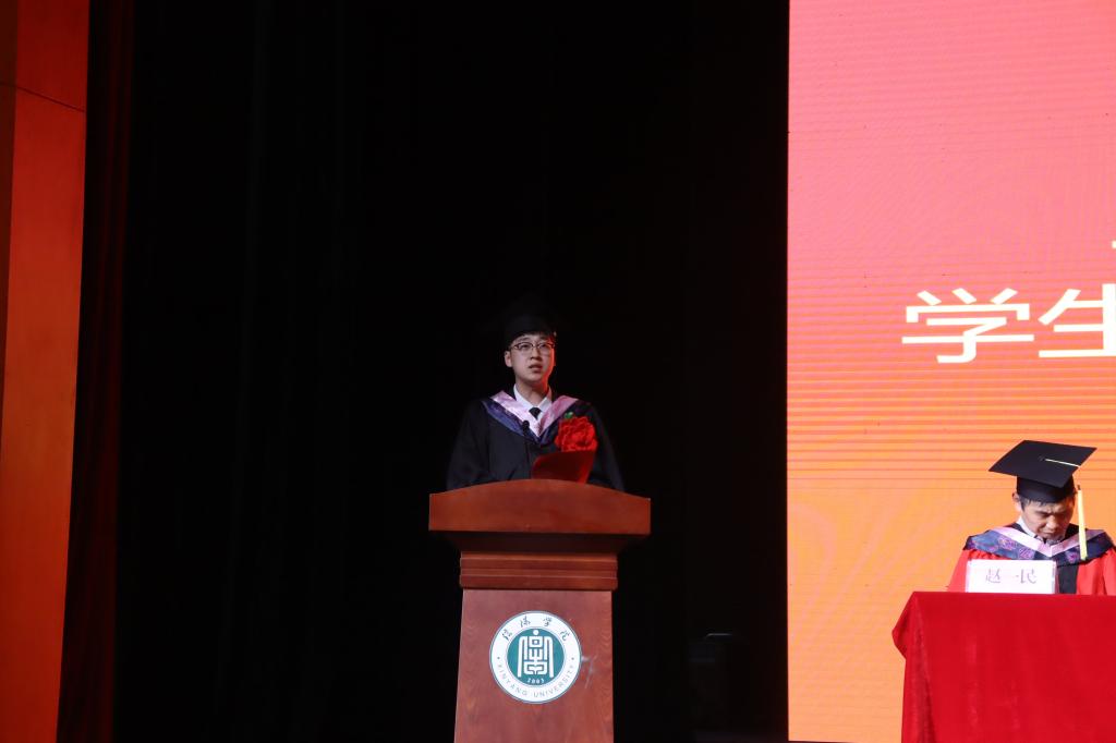 毕业生代表李云辉上台发言。他衷心地感谢老师们的悉心培育,深情回顾了四年的大学时光,青春的脚印留在校园的小路上,笑语欢歌留在花坛的馨香中,母校的每一个角落都珍藏着属于我们的记忆,难舍难分,未来成长的脚步不会停歇,他将会牢记校训和院训,勤勤恳恳做事,踏踏实实做人。最后代表全体毕业生向太阳集团网tyc9728表达美好的祝愿。
