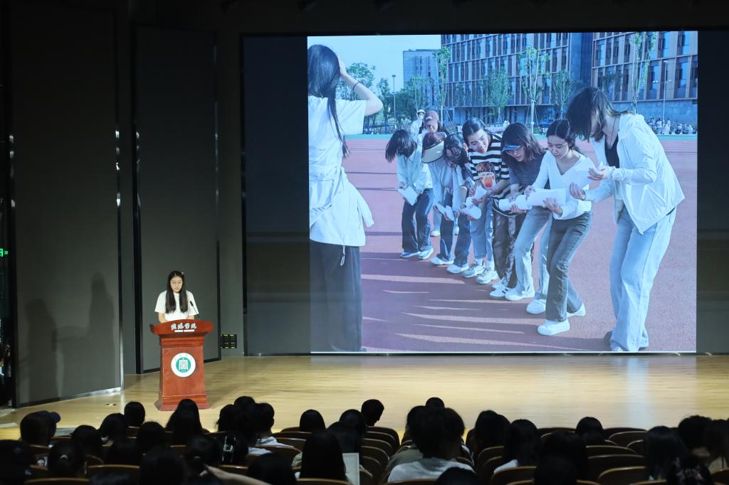 马草青同学围绕“筑防・润心・知礼・启航” 文体活动展开汇报,回顾了历时两个月的七场主题活动:从反诈宣传的沉浸式情景模拟,到羽毛球赛的竞技协作,同学们积极参与,在户外释放压力,欢乐与呐喊交织,协作与拼搏共荣,展现校园青春的蓬勃朝气。