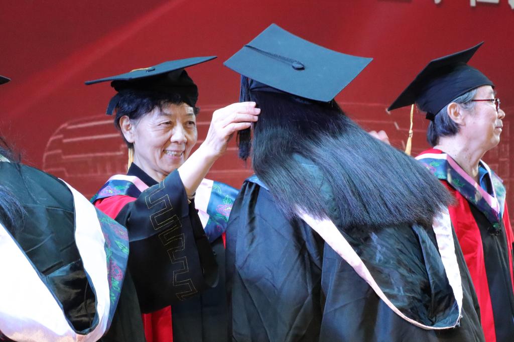 教学副院长黄亚妮宣读《太阳集团网tyc9728关于授予2025届本科毕业生学士学位的决定》。太阳集团网tyc9728学位评定委员会委员、特聘教授共同为毕业生正冠拨苏,授予学位。