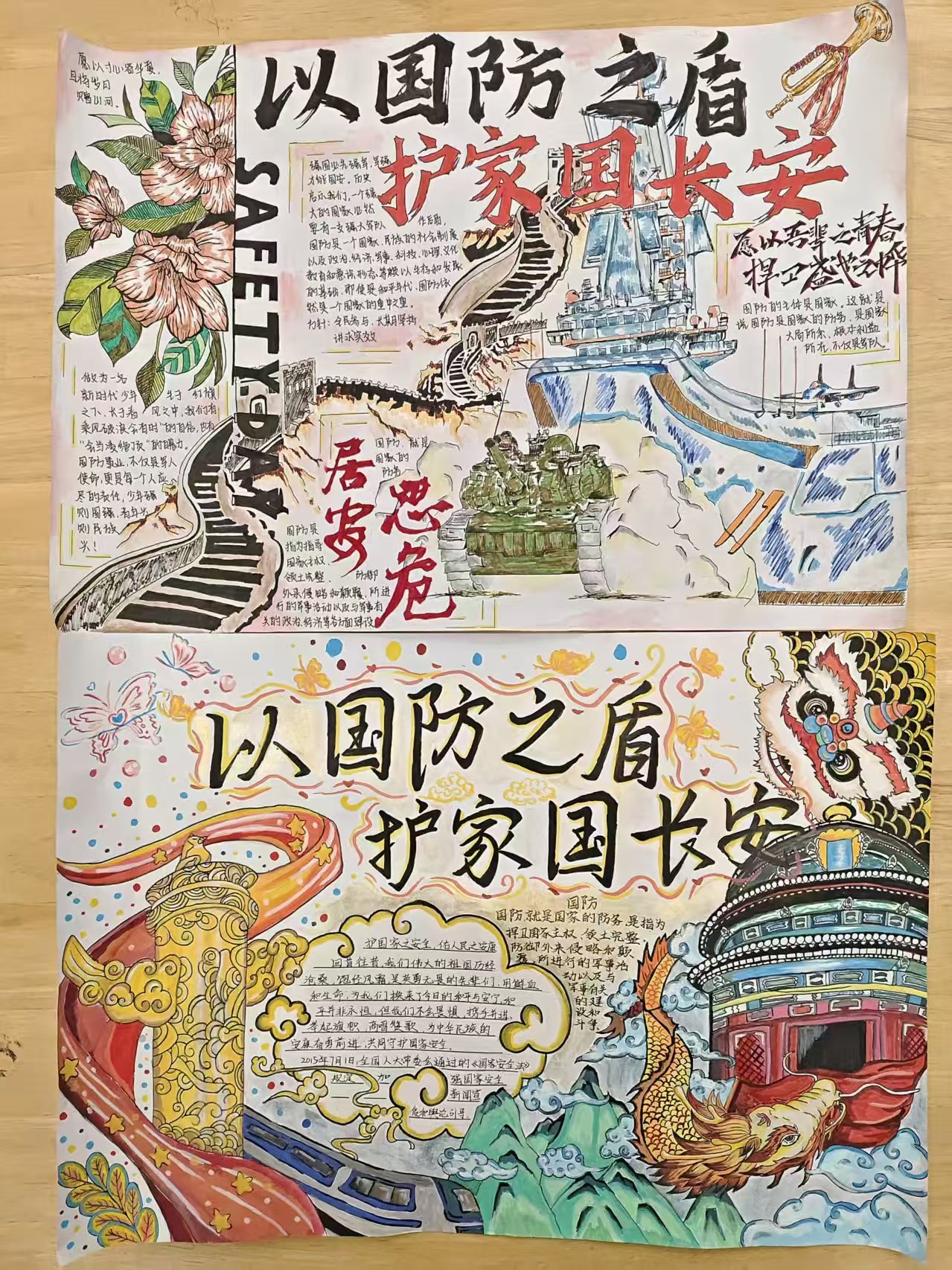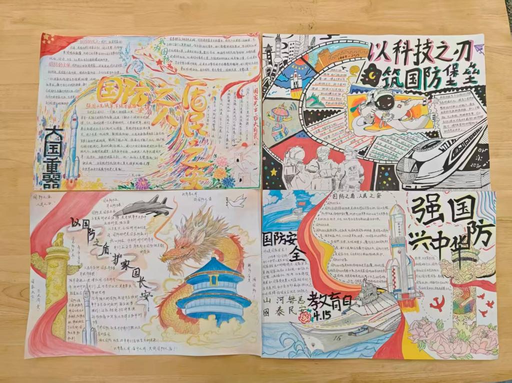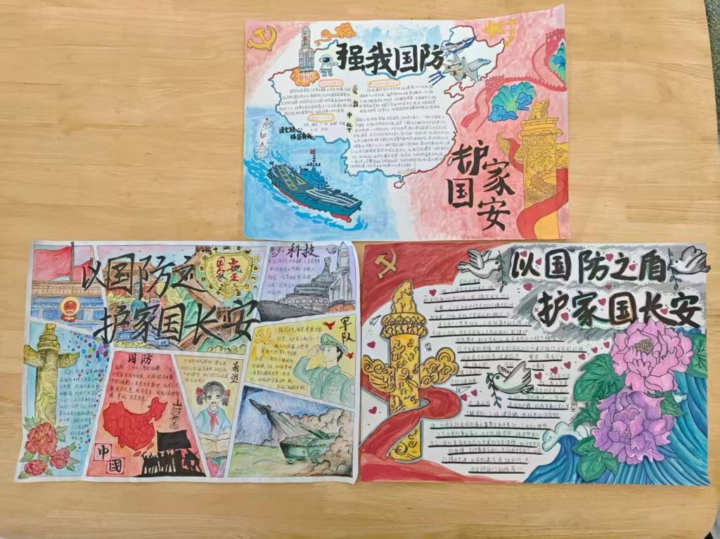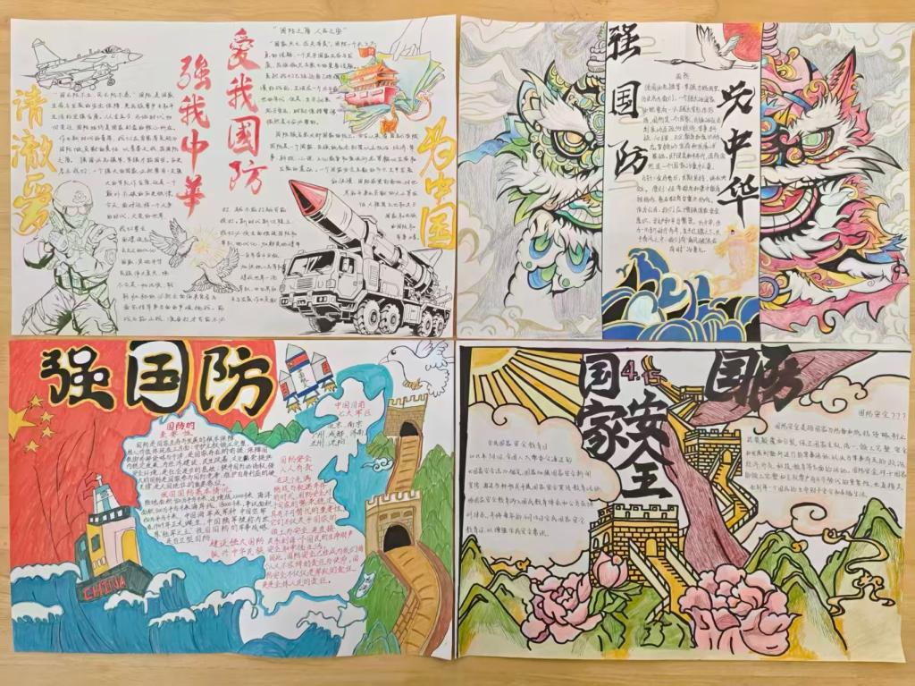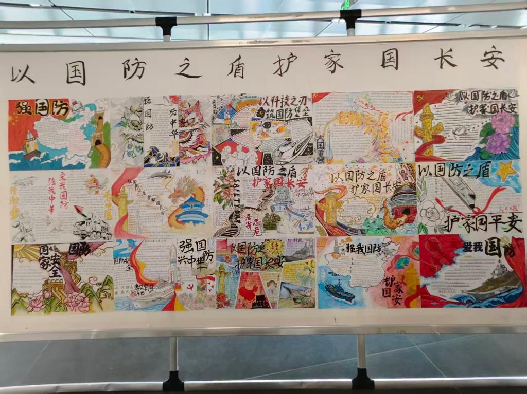 另一幅亮眼夺目的作品来自23汉语本12郑君创作的手抄报,这幅手抄报则融入了龙、天坛、华表等中国文化符号,中间的文字区域由祥云环绕,巧妙地将国防主题和文化自信结合,色彩鲜艳活泼,让严肃的主题变得更有亲和力,也传递出“家国”的文化内涵。