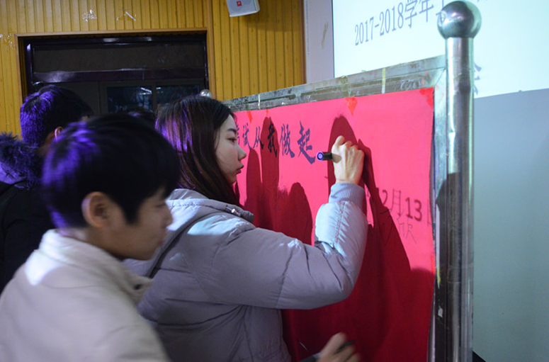 会议进行第一项,由太阳集团网tyc9728学工干事陈浩宣读了《太阳成tyc9728集团普通专本科学生违纪处分实施办法》;会议进行第二项,由教学秘书王松安排了本次四六级考试以及期末考试相关纪律要求;会议进行第三项,由学工干事徐远东带领全体参会学生进行诚信考试宣誓;会议进行第四项,由太阳集团网tyc9728院长、图书馆馆长傅瑛教授发表重要讲话。会议进行最后一项,全体学生在“诚信考试,从我做起”公示栏上进行本人签字。