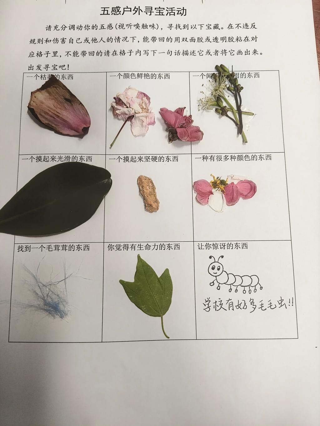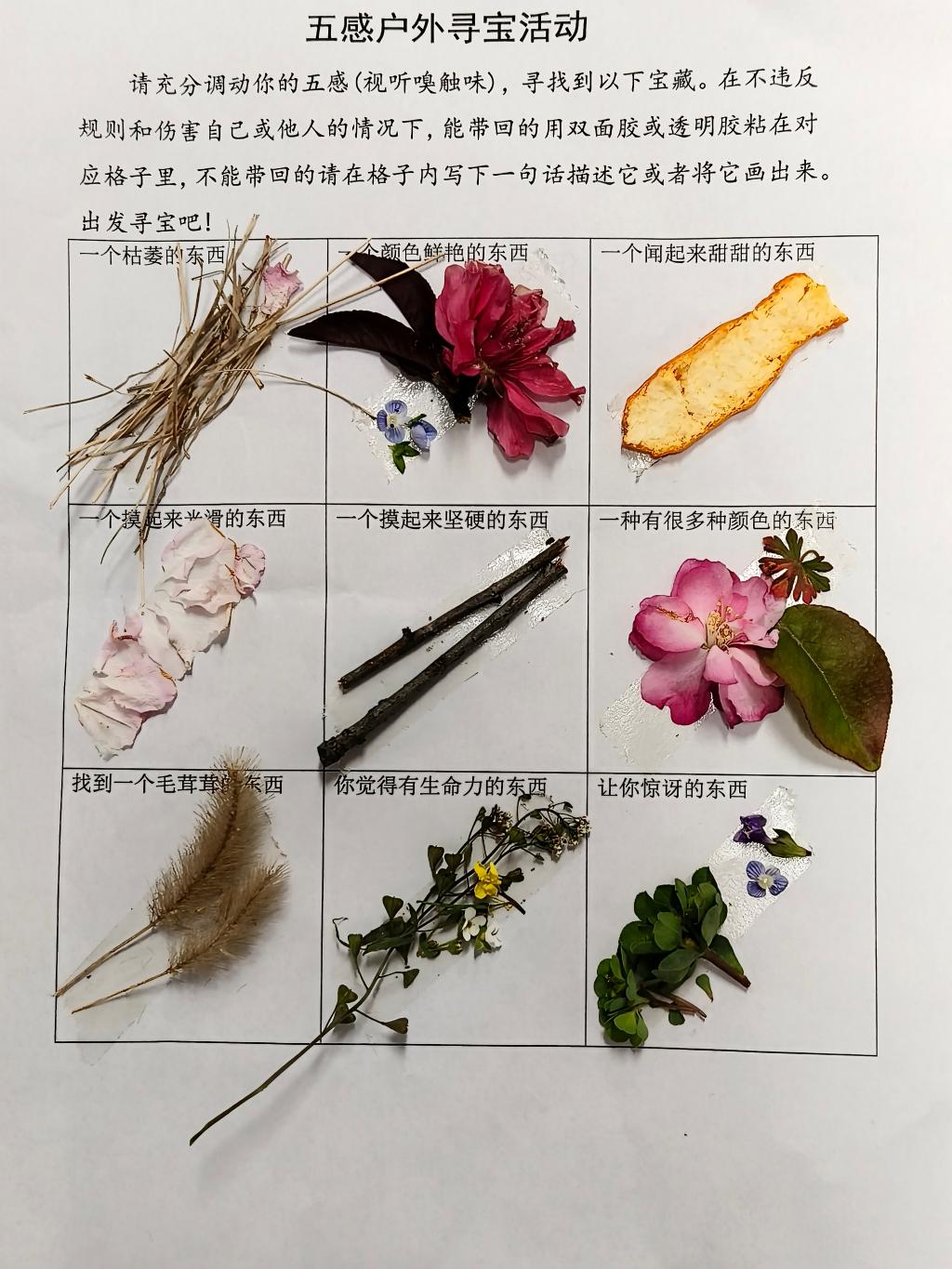 在“五感户外寻宝”过程中,同学们通过调动五感探索户外,发现生活中的小确幸,在不断的探索中寻找属于生活和校园的美。活动伊始,同学们通过提前发布的“户外寻宝游戏”记录单寻找相关物品,如一个枯萎的东西、一个颜色鲜艳的东西、一个闻起来甜甜的东西。寻宝过程中,同学们发散思维,不断寻找与之接近的事物,于文字和物品中表达自己内心的情感,展示自己发现的美。心理健康部干事全程协助同学们,确保活动的有序进行。