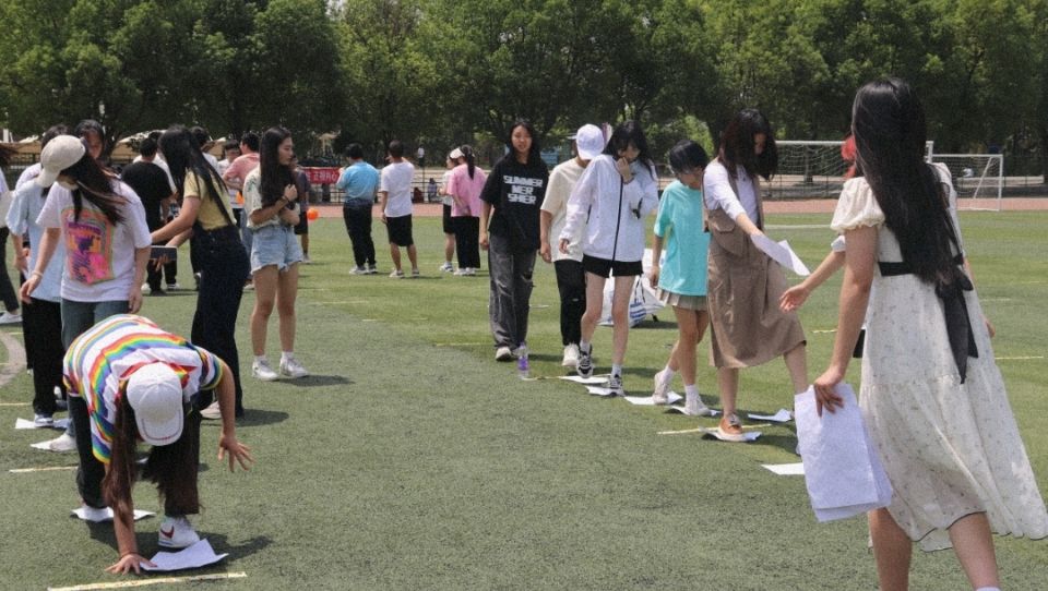 摸石过河游戏,同学们分成两队,除最后一名队员,每人各有两张A4纸,通过脚下传递A4纸,这不仅增强了团队的凝聚力,还提高了队员之间协作能力。双人夹球跑,同学们奋力吹气球、拼命向前跑。一方面,锻炼配合能力;另一方面,合理释放压力。yes or no游戏,主持人问是非题,同学们需要快速做出反应,这个游戏锻炼了同学们的反应能力。传递呼啦圈游戏,同学们手牵手围成两个大圈,每位同学不允许用手触碰呼啦圈,以顺时针方向传递给旁边同学,大家积极主动,以饱满的热情参与游戏,尽情释放压力。