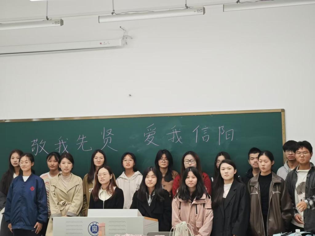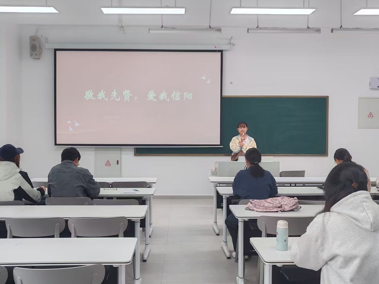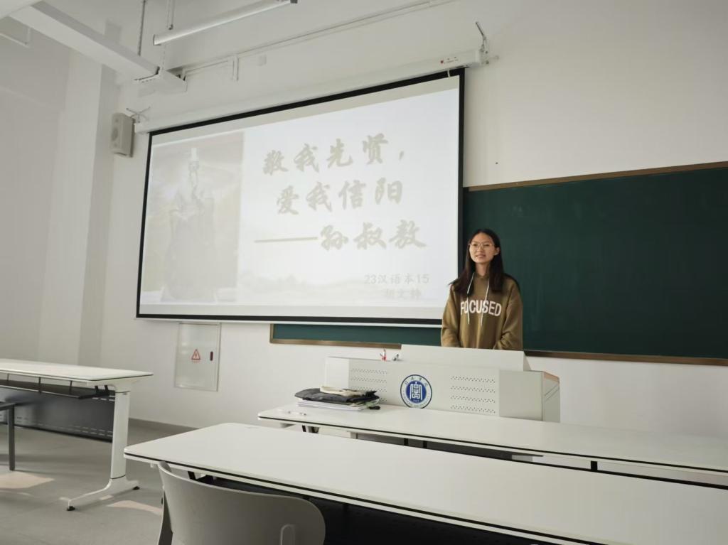李增亚娓娓道来,从信阳地理位置入手,向我们介绍了淮河第一城信阳,紧接着向我们介绍息夫人、吴焕先、邓颖超等历史名人,并为我们讲解了信阳历史文化,从新石器时期至近现代,罗山的皮影、信阳的毛尖、鸡公山等等,让同学们更加深刻地感受到信阳这座古城的历史韵味。王芳芳为我们讲述革命烈士吴焕先的英勇事迹,描绘了革命道路上战士们舍己为国,英勇战斗的壮丽篇章,宣传了红色革命文化,更加激起我们对革命先烈的敬佩。
