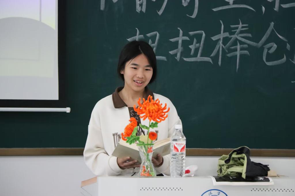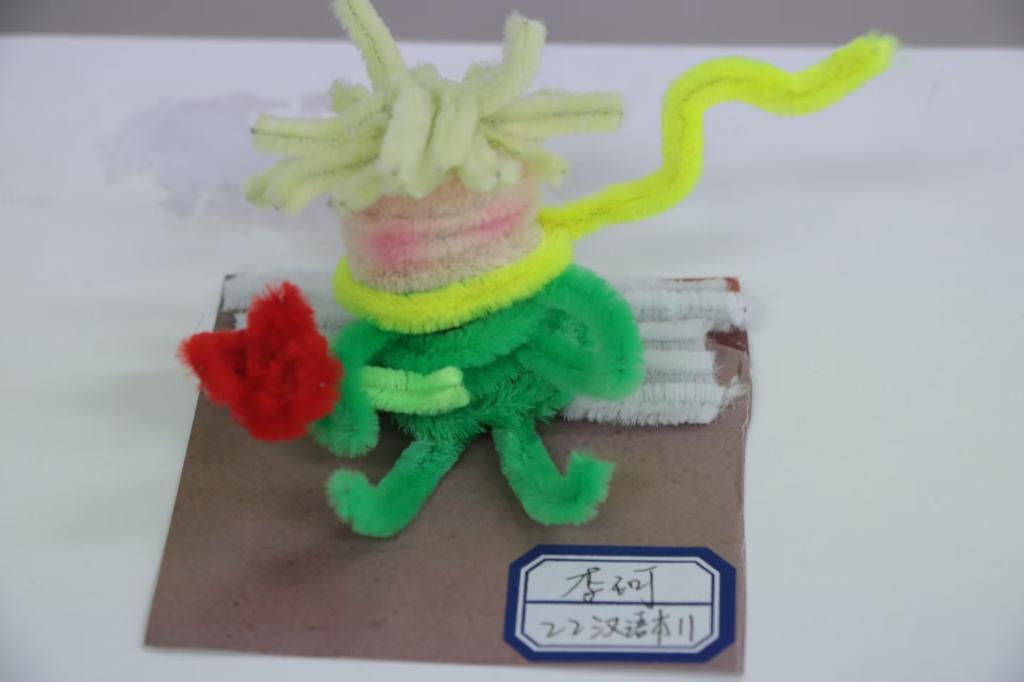 创作完成后,同学们纷纷手持自己的作品,走上讲台分享其背后的灵感与创意。其中,雷雨欣同学向大家展示了她创作的一朵黄色菊花,灵感来自四大名著之一《红楼梦》中的《咏菊》一诗,“一从陶令评章后,千古高风说到今。”这一艺术与文化的交融,赢得了在座同学的认可。王静然同学带来的则是一朵红色玫瑰与一位“小王子”,《小王子》一书中玫瑰象征着爱的守护与思念让她感触深刻,同时主人公小王子的那份童真与童趣也是王静然同学想要借助这部作品传递给大家的。