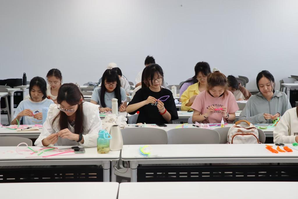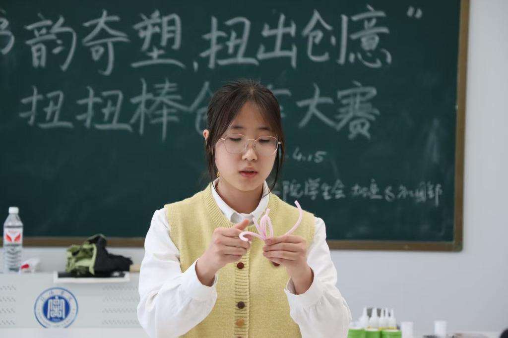 比赛开始前,主持人细致地向在场同学们讲解了比赛规则,并详细说明了作品的评分标准。为了让同学们更好地掌握扭扭棒的使用技巧,千千结艺社的吕菲菲同学耐心地为大家演示了几种简单而实用的基础操作方法。她的演示生动直观,为同学们打开了创意的大门,激发了大家的创作灵感。