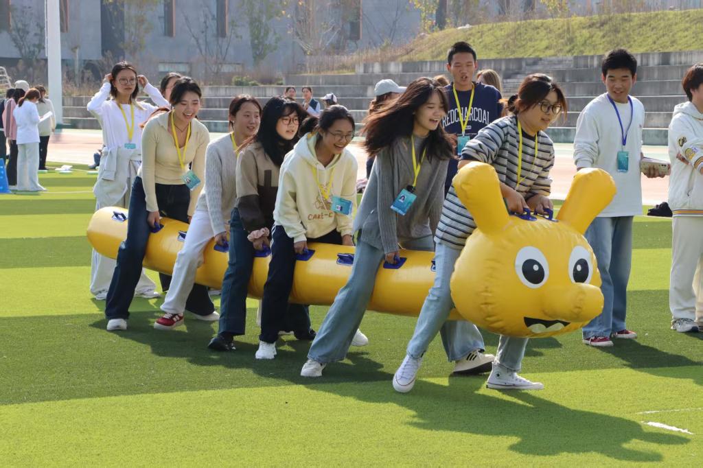 在“车轮滚滚”活动中,各队队员紧密协作,共同置身于大型“车轮”之内。随着口令发出,队员们默契配合,推动“车轮”稳步向前。活动现场气氛紧张而热烈,此起彼伏的呐喊声将比赛氛围一次次推向高潮。此次活动不仅是对团队协调性与统一性的深度考验,更展现了我院学子团结一心、奋勇向前的精神风貌。此外还有“疯狂毛毛虫”“袋鼠运瓜”“拔河比赛”“跳大绳”“碰碰球大爆炸”等14种趣味活动,现场热闹非凡。