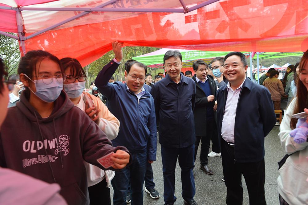 校领导每到一个社团前,都详细询问社团发展情况,同师生们亲切互动交流。在大别山精神学习研究会展位前,校领导在与社团指导教师交流时指出,协会要把传承红色基因、弘扬大别山精神作为自己的光荣使命,通过开展社会调查、撰写调查报告、重走红色路线、参观革命纪念馆、举办主题演讲比赛、排演红色话剧等多种形式,引领学生学习党史,在党史学习中培育家国情怀,增强使命担当。要注重社团资料收集、凝练和提升,积极申报省级有关项目,提升社团活动的影响力,打造我校思想政治教育新名片。