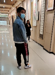 展厅作品别具一格,有草书、行书、篆书、隶书,各具特色。展厅作品中有教师的书法作品,一笔笔铿锵有力这是成年累月的积累;也有专门习草书的作品写得龙飞凤舞,令人如醉如痴。书法作品里融入了儒家的坚毅,果敢和进取,也蕴涵了老庄的虚淡,散远和沉静闲适,还往往以一种不求丰富变化,在运笔中省去尘世浮华以求空远真味的意味,拥有好的书法功底,不在于一朝一夕,笔势节奏都需要观展者慢慢体会。布展区人来人往,同学们时而驻足观看,时而停下来低声交谈,场面十分令人欢喜。