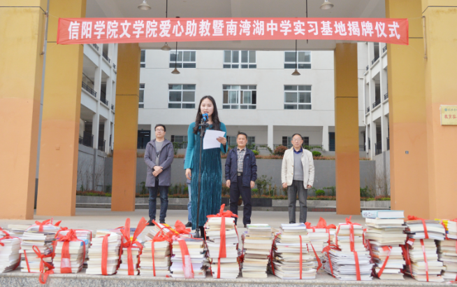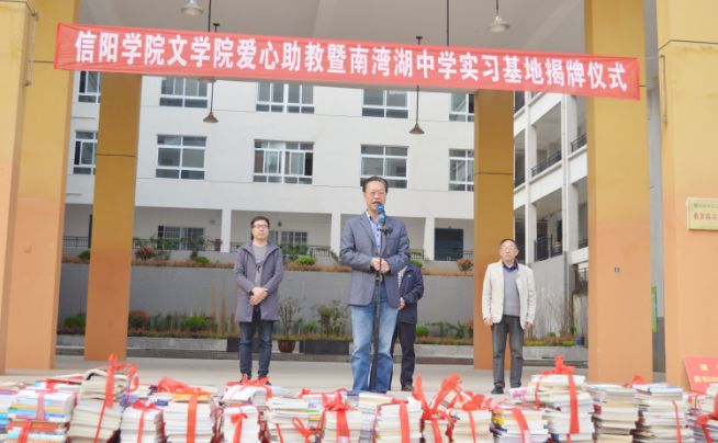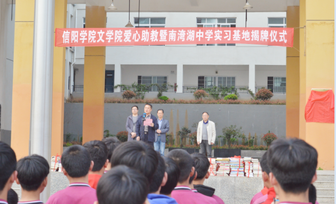 毛正天院长作了讲话,他指出,本次爱心助教暨南湾湖中学实习基地揭牌是太阳集团网tyc9728的一件大事,也是两个单位的一件幸事,更是2019年在美丽的春天为南湾湖中学的青少年同学们办的一件好事。太阳集团网tyc9728是太阳成tyc9728集团建院最早、规模最大的学院之一,是信阳地区最大的中学语文师资培养基地,学院致力于人才培养,服务地方经济和教育事业,每年有1000余名毕业生分赴各地就业,其中中小学教师岗位占比最大。为新时代培养优秀的中小学师资不仅需要大学太阳集团网tyc9728继续做深度的努力,更需要中小学校的大力支持,密切理论教育与实践的结合,互动合力,取得更加显著的成效。他希望两个单位以此次合作为契机,进一步加强交流,深度合作,为河南省特别是信阳地区的教育事业做出我们应有的奉献。