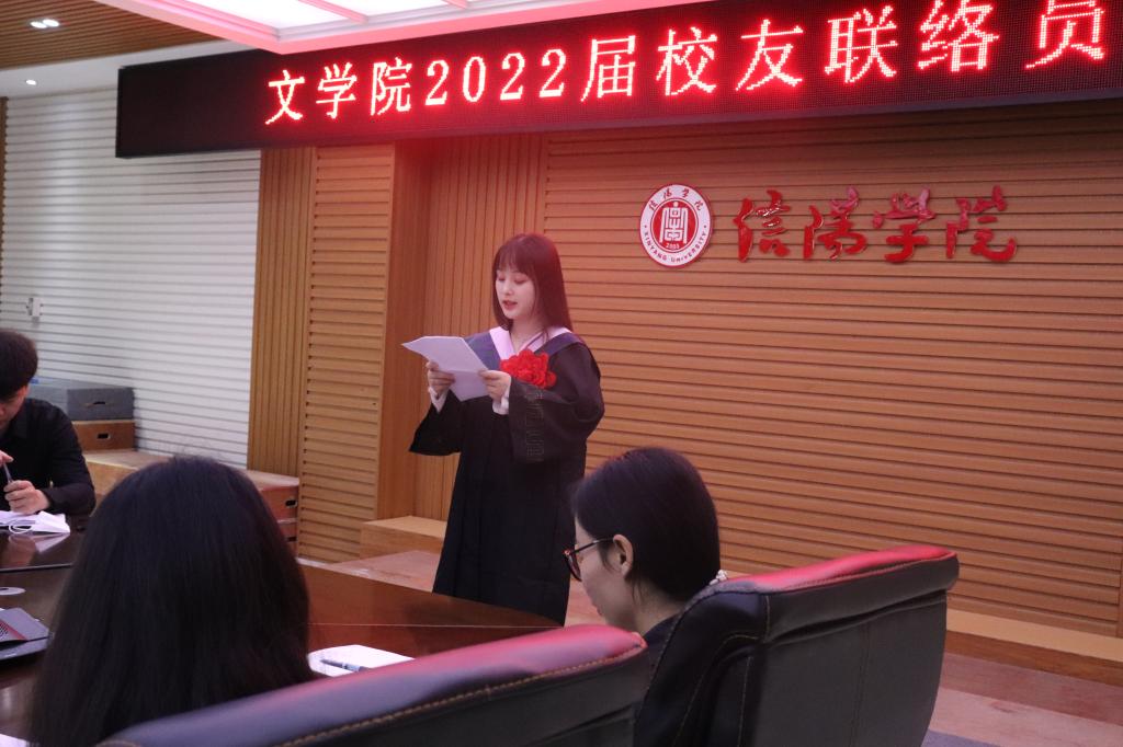副院长黄亚妮宣读《太阳集团网tyc9728关于聘任2022届校友联络员的聘任决定》。宣布经过班级推选,院领导审核报校友办审批,决定聘任李瑞晓等12名同学为太阳集团网tyc97282022届校友联络员。并表示希望各位校友联络员不负学校重托,立足本职岗位,关心校友进步,情系母校发展,保持与母校和校友的密切联系,广泛联系校友,积极参与各项校友活动,以高度的责任心和崇高的奉献精神,为校友工作做出积极贡献。