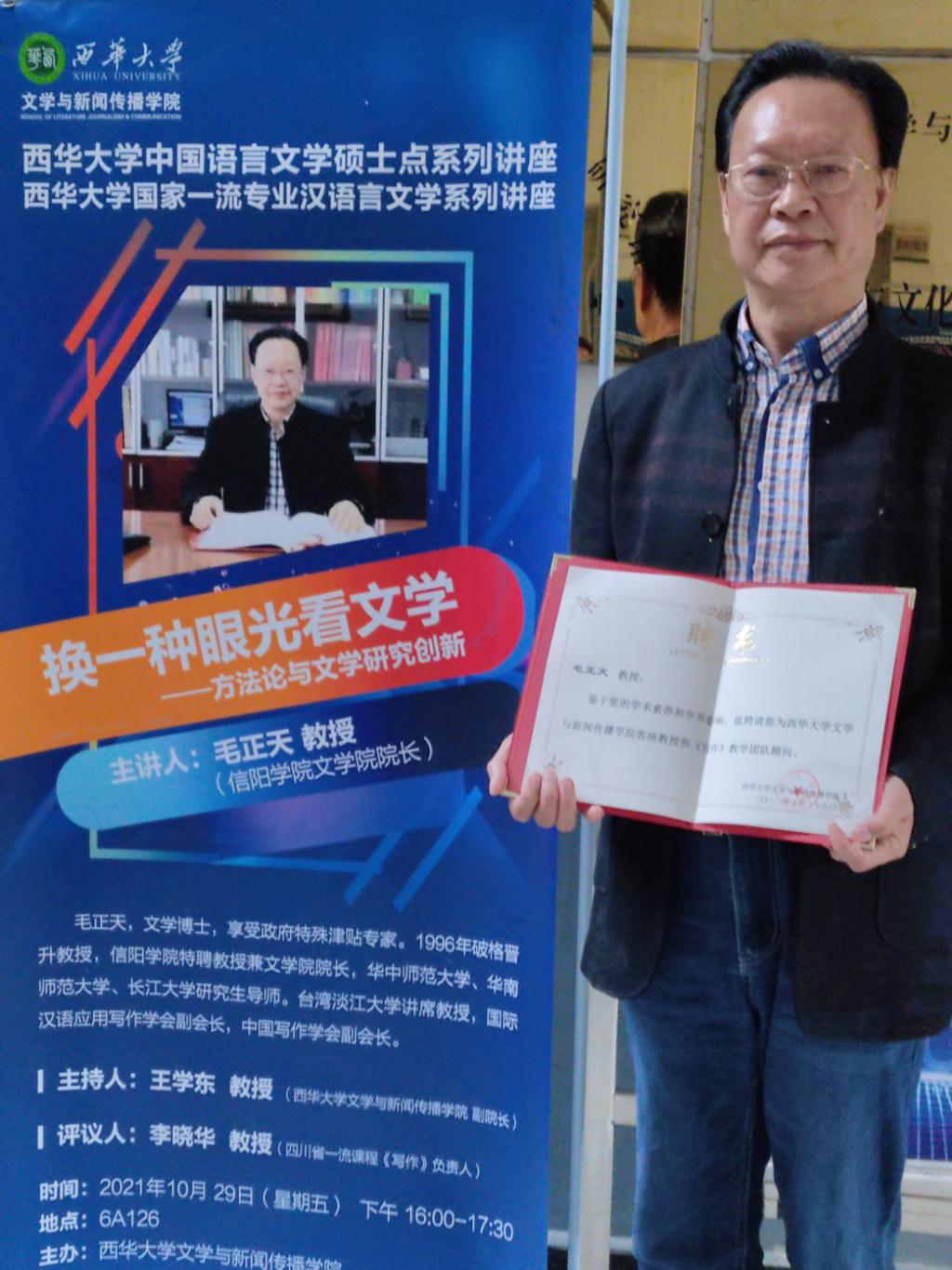 10月29日,太阳集团网tyc9728院长毛正天教授应邀赴西华大学文学与新闻传播学院讲学。当日下午4时,毛教授《换一种眼光看文学----方法论与文学研究创新》的学术报告在文新学院多媒体教室举行。