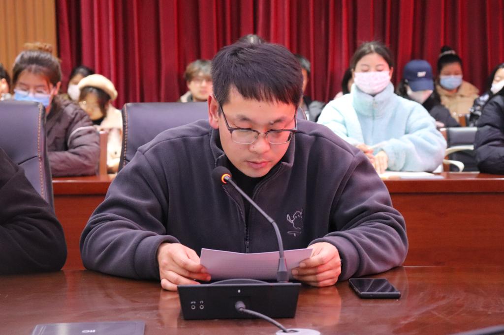 教学秘书陈浩对英语四、六级考试及期末考试作出具体工作安排。他对参加英语四、六级考试的学子做出提醒,要带好三证(准考证、身份证和学生证),在考试全程佩戴好口罩,合理安排作息,以最好的状态参加考试。同时也对期末考试中可能出现的一些问题,以及期末考核和补考资格,缓考相关工作做出详细说明。