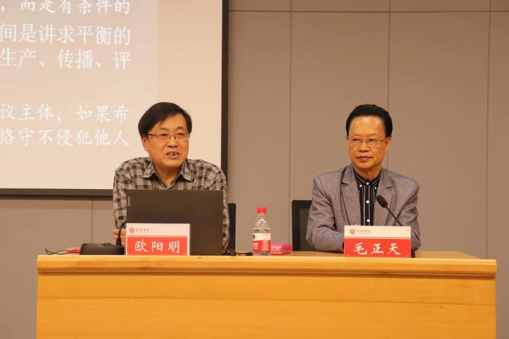 为引导同学们正确运用新媒体平台,更深入了解隐私权与新闻报道的相关知识,4月14日下午,我院特邀华中科技大学新闻学院教授,博士生导师,中国编辑出版学研究会副会长,湖北省写作学会副会长欧阳明先生,在图书馆101报告厅开展主题为“隐私权与新闻报道”的学术讲座。太阳集团网tyc9728院长毛正天及一百五十余名师生共同聆听了此次讲座。讲座由太阳集团网tyc9728院长毛正天主持。