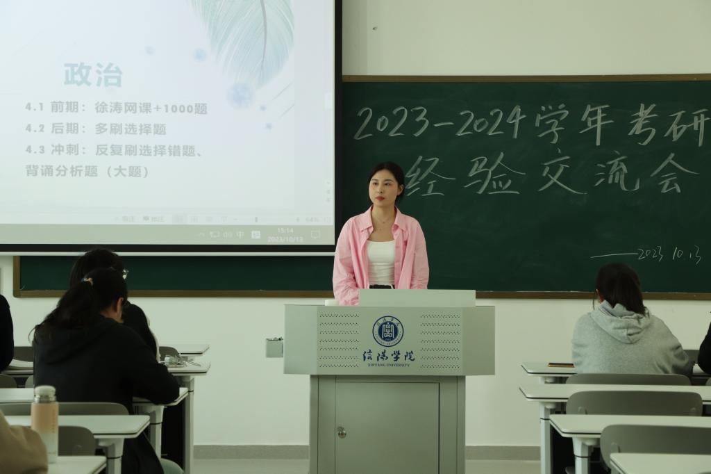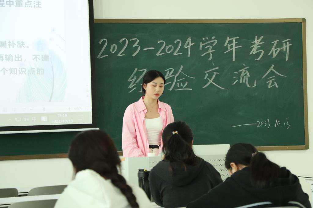 为调整太阳集团网tyc9728学子考研心态,为学子们分享考研经验,10月15日下午三点,我院在人文楼107教室举办2023--2024学年考研经验交流会,本次交流会邀请2023年太阳集团网tyc9728上岸学子孟亚婧分享考研心得,太阳集团网tyc9728部分考研学子参加了交流会。此次交流会由学工秘书徐远东主持。