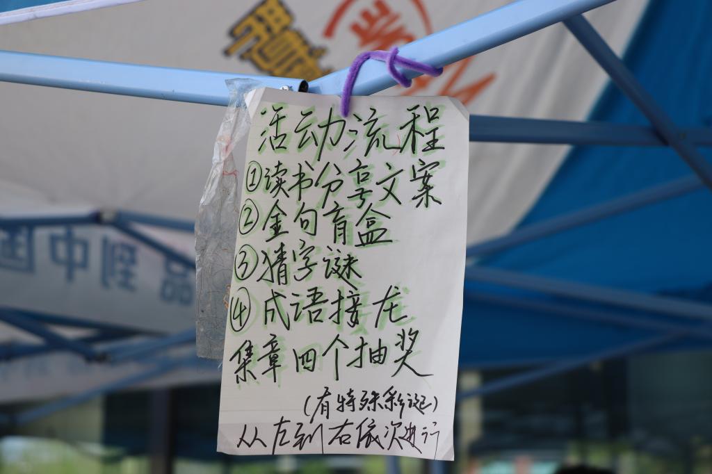 本次活动由“读书分享文案”“金句盲盒”“猜字谜”“成语接龙”四个环节构成,参与人员在完成指定任务后可领取奖励,其中活动礼品有多巴胺小扇子、精品钥匙扣、小糖果、扭扭棒等等。